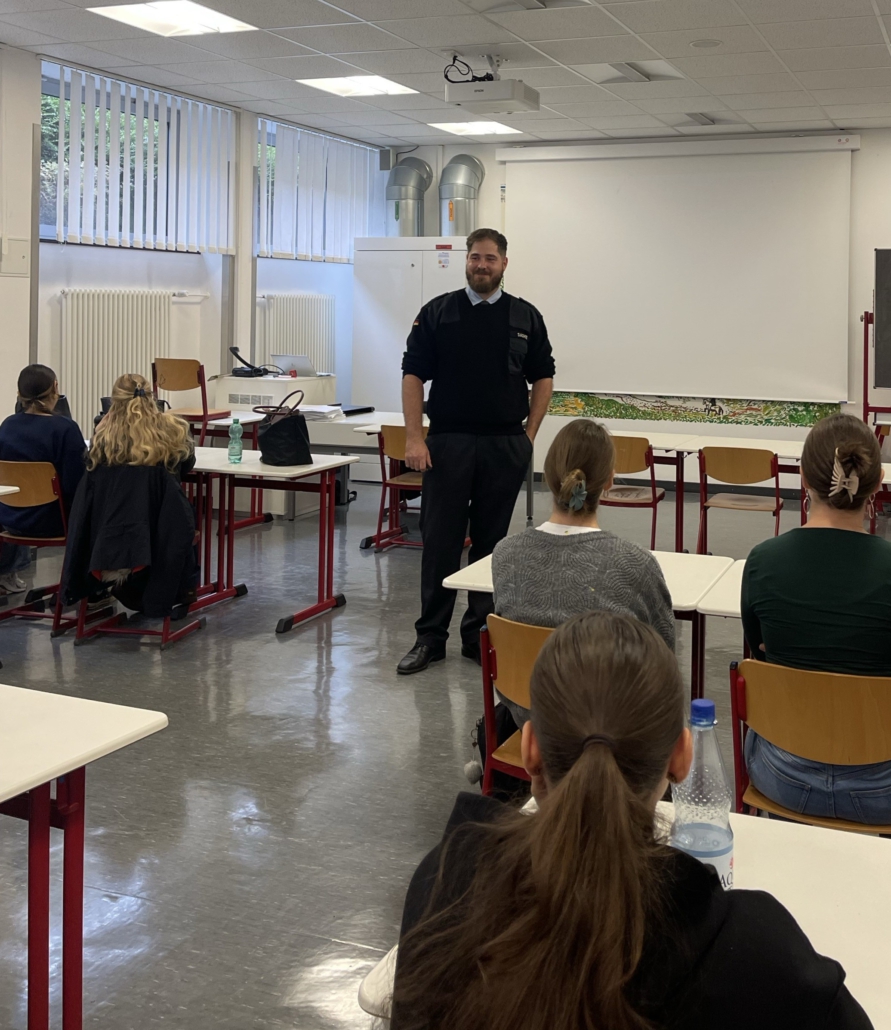 Hauptmann Sachße bietet den Schülerinnen und Schülern einen fundierten Einblick in sicherheitspolitische Zusammenhänge